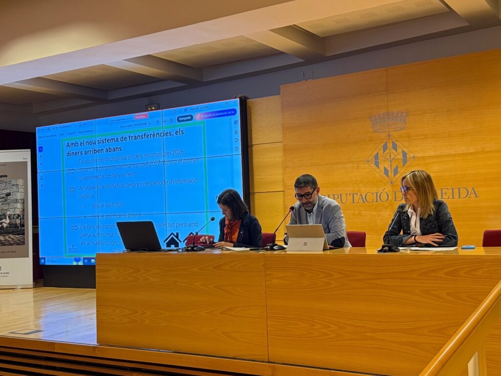 El passat dilluns, el diputat de Salut i Esports, Òscar Martínez, va presentar davant dels alcaldes de la demarcació el Pla de transferències de Cooperació, dissenyat per a recolzar el finançament de les inversions necessàries que els ajuntaments i les entitats municipals descentralitzades de Lleida hauran d’afrontar per a les anualitats 2026 i 2027. Amb un pressupost de 30 M€, aquest pla inclou inversions en àmbits com l’aigua, equipaments esportius i la retirada d’amiant.