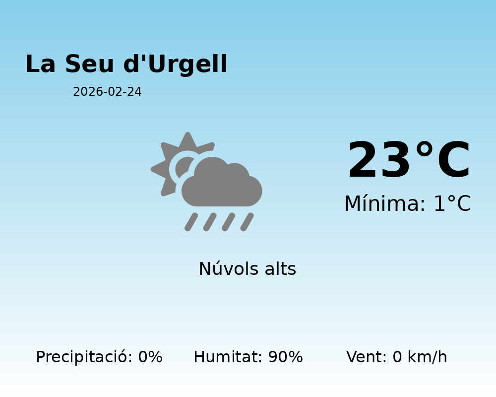 Avui, a La Seu d’Urgell, gaudirem d’una jornada amb temperatures agradablement contrastades. La temperatura màxima prevista és de 23°C, mentre que la mínima caurà fins a 1°C.