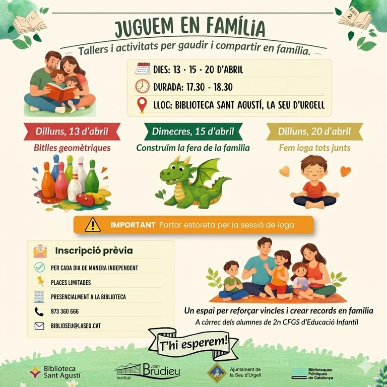Les inscripcions són obligatòries i es poden realitzar presencialment a la biblioteca o a través del telèfon 973 360 666 i el correu electrònic biblioseu@laseu.cat. Aquestes propostes compten amb el suport de l’Ajuntament de la Seu d’Urgell i reflecteixen l’objectiu de la biblioteca de ser un espai de cohesió social i educativa.