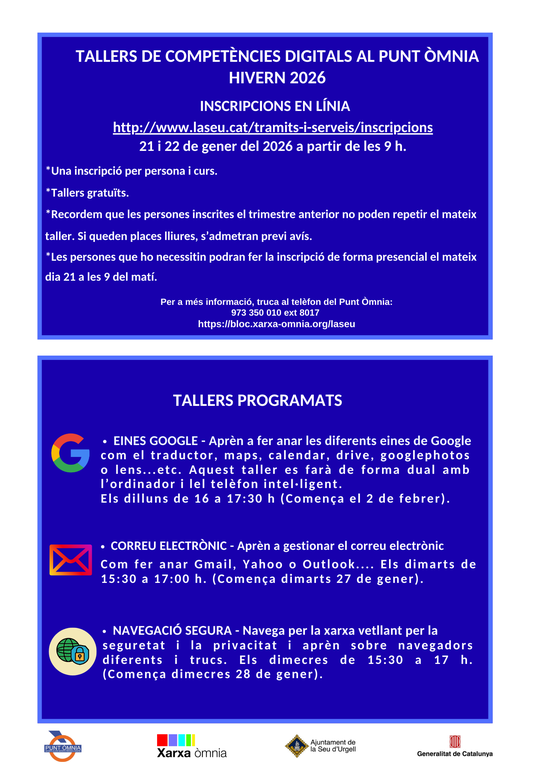 El Punt Òmnia de La Seu d’Urgell ha anunciat la disponibilitat de tres tallers gratuïts enfocats a millorar les competències digitals dels participants aquest hivern 2026. Els tallers inclouen temes com les eines Google, la gestió del correu electrònic i la navegació segura.