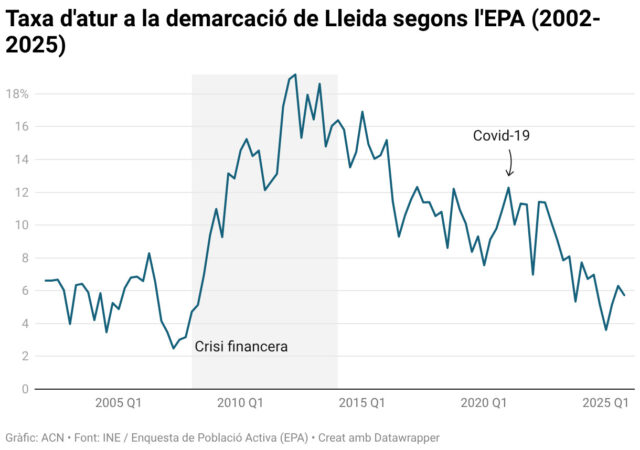 ACN Madrid – Les comarques de Ponent i l’Alt Pirineu i Aran van tancar el 2025 amb una taxa d’atur del 5,73% i una xifra de 227.000 persones ocupades, segones les dades del quart trimestre de l’Enquesta de Població Activa (EPA) que ha publicat aquest dimarts l’Institut Nacional d’Estadística (INE). L’indicador de desocupació s’ha reduït un 0,56% en comparació amb les dades del tercer trimestre de l’any passat. En comparació amb el tancament del 2024, s’han creat 13.200 nous llocs de treball. Per sectors, tots creixen i l’agricultura puja fins als 17.800 treballadors, la industria fins als 38.000, la construcció als 25.200 i el sector serveis 146.800.