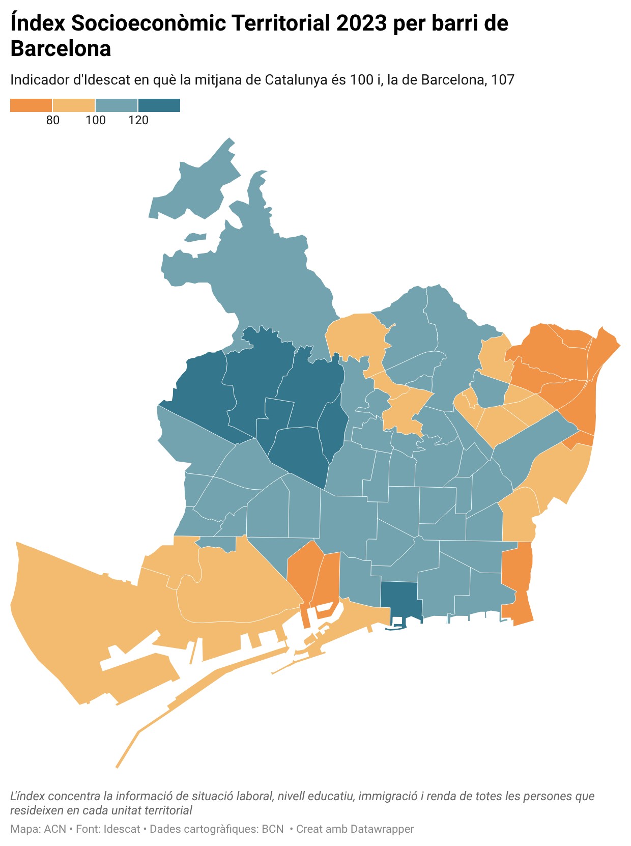 Les dades d’Idescat també es presenten pels 73 barris de Barcelona. A la cua, destaquen Ciutat Meridiana (67,8), el Besòs i el Maresme (72,8), el Barri Gòtic (73,9), la Trinitat Vella (74,7) i Torre Baró (76,3). A l’altre extrem, hi ha 9 barris amb un IST igual o superior a 120, entre els quals les Tres Torres (132,1), Sant Gervasi – Galvany (128,2), Sarrià (127,3), Sant Gervasi – la Bonanova (126,4) i Pedralbes (125,6).