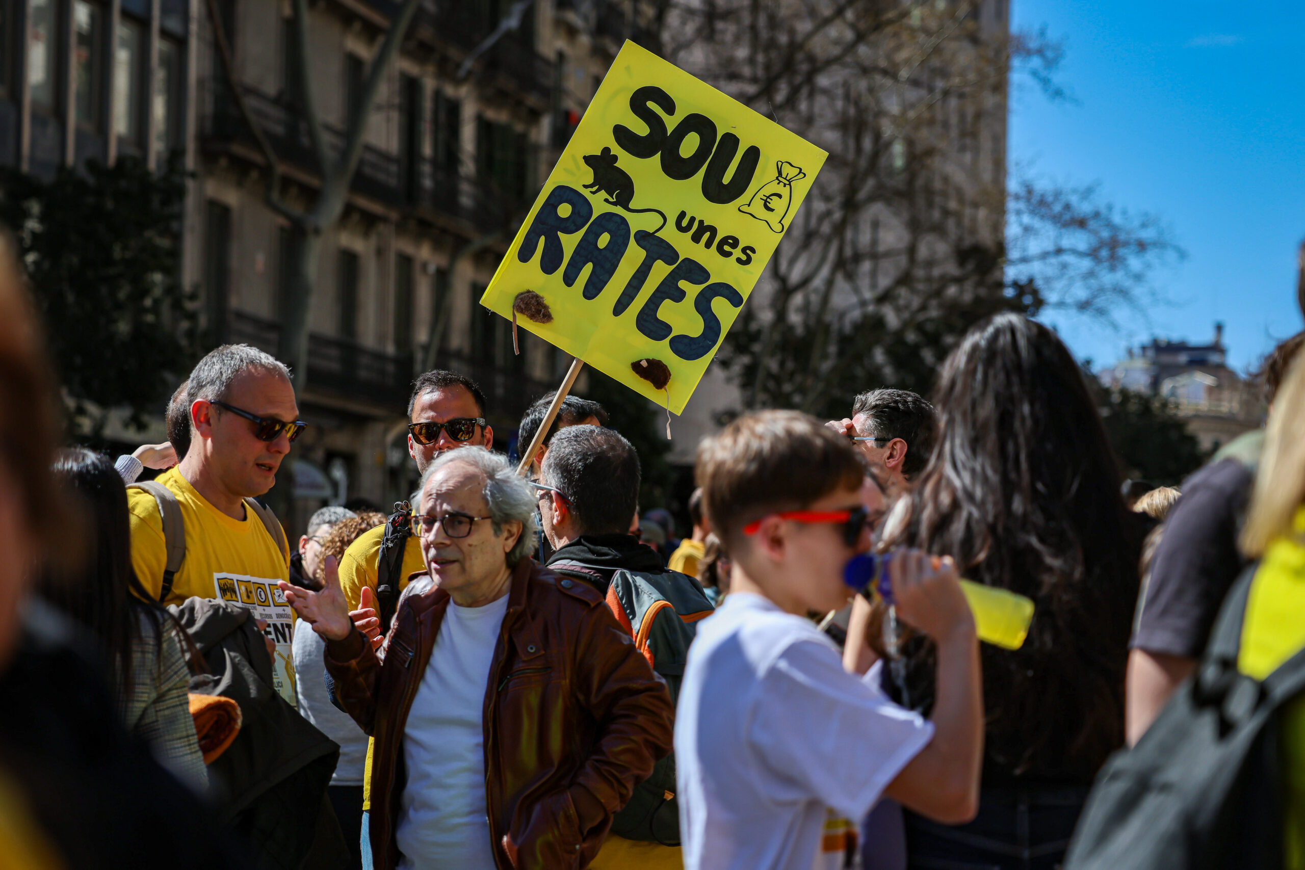Més avall, abans d’arribar a la seu de CCOO a tocar de la plaça de l’Àngel, han cridat “No és un acord, és una traïció”, “cap acord sense consulta”, i “No signarem aquest acord de merda”. La seu de CCOO estava blindada pels Mossos, i els manifestants han girat cap a plaça Sant Jaume.