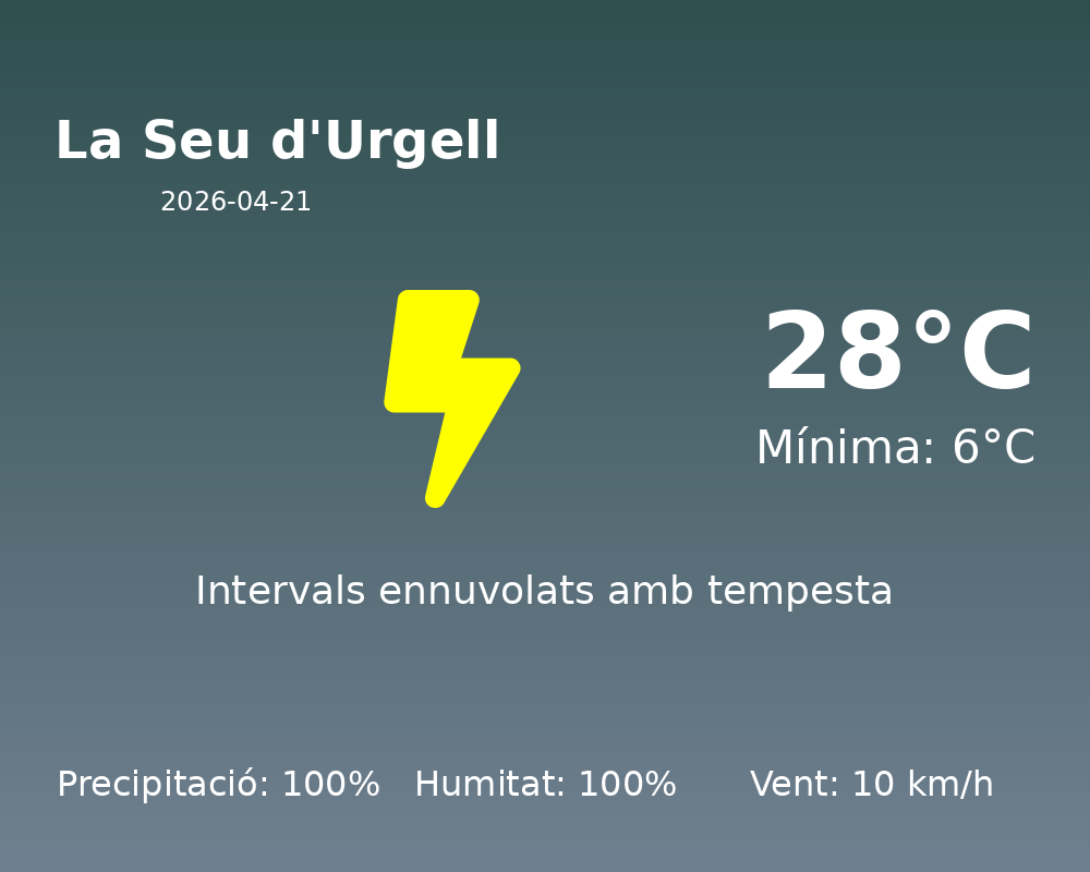 En resum, prepareu-vos per a un dia càlid i humit a La Seu d’Urgell, amb pluges segures. Recordeu adaptar la vostra indumentària a les condicions canviants de temperatura i meteorologia.