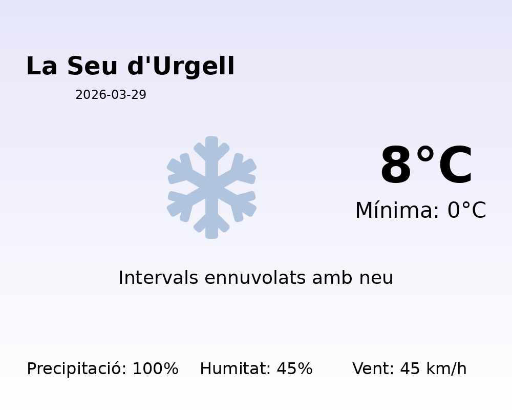 Benvinguts a la predicció meteorològica per avui a la ciutat de La Seu d’Urgell. Segons les dades disponibles, es prepara un dia d’hivern encara força fred per a aquesta època de l’any.